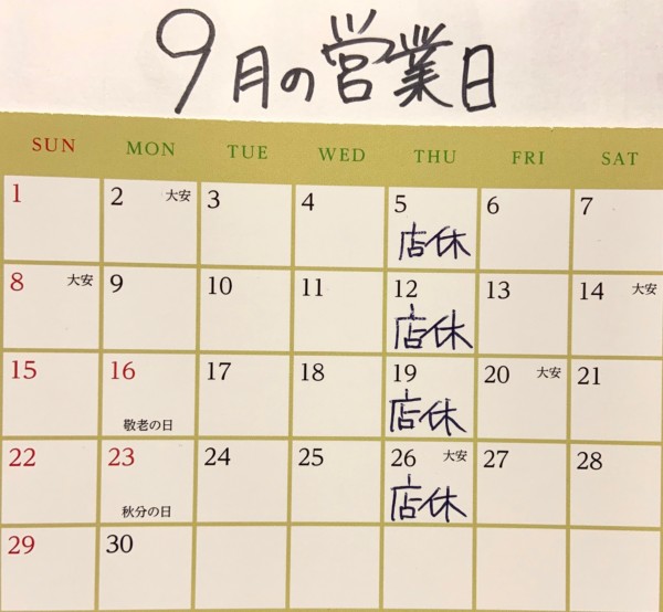 そして、9月の営業日のお知らせ